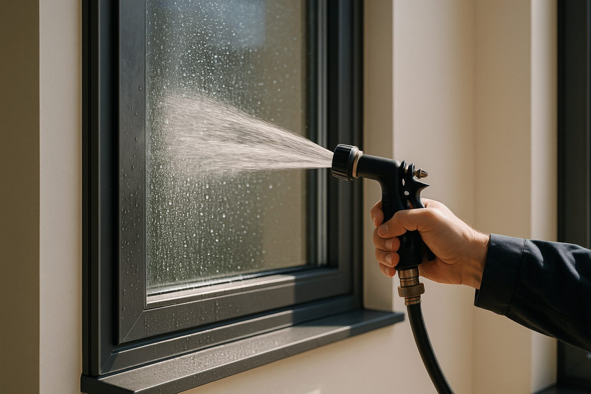 - Water Spray Test: A simplified version of ASTM E1105, this method uses a garden hose with an adjustable sprayer to simulate rain. Spray water on different parts of the window – frame joints, where the window meets the wall, and operable components – while someone monitors the interior for leaks. Perform this test during calm weather to avoid wind interference.